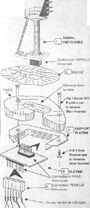 Le signal est enfiché sur la platine à travers le plan de roulement préalablement percé, et le facilité de son extraction ou de sa remise en place, sans toucher aux fils, est particulièrement agréable lorsqu’on doit par exemple modifier le décor, ou …passer l’aspirateur ! |
